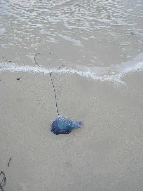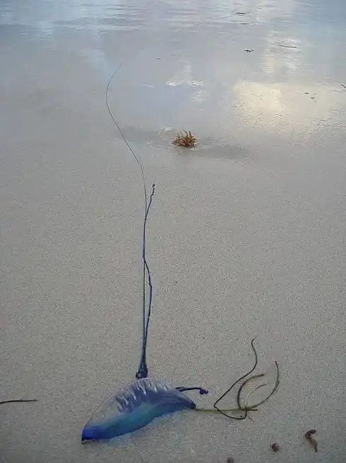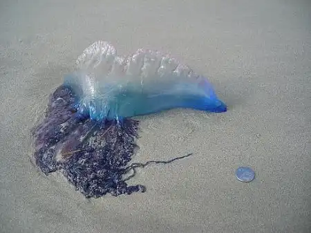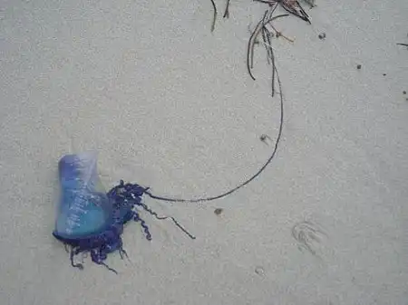 Со стороны он выглядит кк голубой с пурпурной полосой надутый рыбий пузырь, которого носит по волнам. Именно по волнам, надутый воздухом пузырь (по-научному пневматофор) удерживается над поверхностью воды. А под водой самое интересное - длинные, толчайшие голубые щупальца.