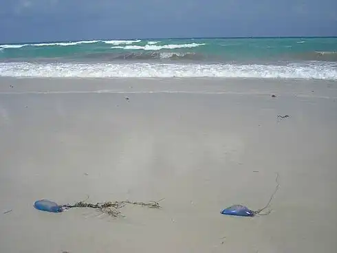 Спасатели ходили по пляжу, методично лопая голубые пузыри (мы сами попробовали - если кинуть на него камень, то он весело взрывается как надутый пакет).
