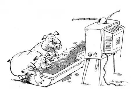 Жадность. Ради вожделенного приза участники передачи готовы буквально сожрать друг друга, втоптать в грязь, унизить, выкинуть из своего круга. Выживает сильнейший, в том числе подлейший, хитрейший, жаднейший и т.д. Телевидение внушает зрителю, что для выживания хороши практически любые способы.