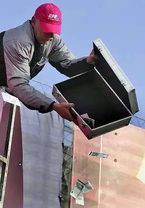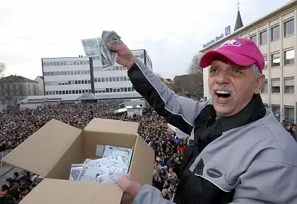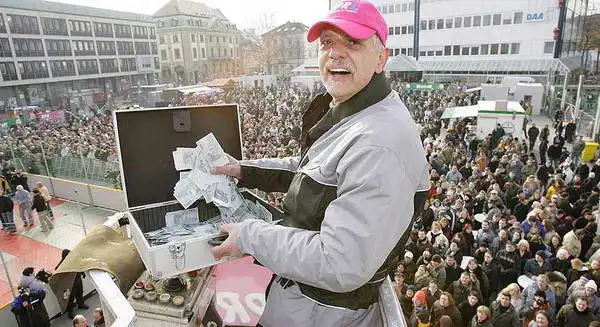Жители немецкого Кайзерслаутерна проснулись сегодня пораньше. Накануне было объявлено, что победитель конкурса, который объявила одна из местных радиостанций, будет выполнять условия своего выигрыша на центральной площади города. Радиостанция пообещала, что тот, кто даст самый глупый ответ на вопрос "Что бы я сделал за сто тысяч евро?" получит всю сумму сполна. Варианты ответов были разные. Одна женщина была готова выдернуть все зубы без наркоза, кто-то предложил распилить свой дом или съесть ведро дождевых червей. Победитель конкурса, которого определили слушатели радиостанции, пообещал разбросать 75 000 евро на площади города. Поэтому сегодня утром на главной площади собралось несколько тысяч человек и водитель-дальнобойщик Марко Хильгерт (49) устроил свой аттракцион – он кидал пачки купюр на специально огороженную площадку, где люди, выстоявшие немалую очередь, ловили денежные знаки. "Ловцы счастья" были распределены в группы по 15 человек и каждая группа находилась на площадке по тридцать секунд.