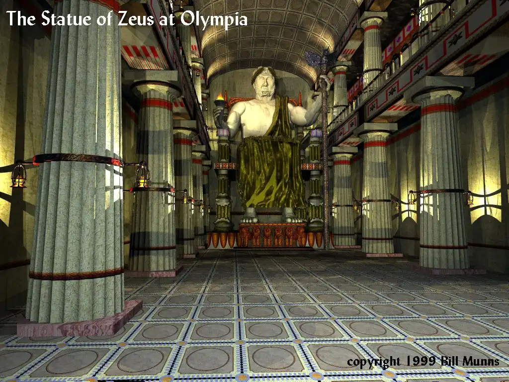 Статуя Зевса Олимпийского — работа Фидия. Изготовлена из дерева. Покрыта слоновой костью и золотом. Храм Зевса разрабатывался архитектором Либоном. Храм построен был в простом стиле и для украшения была созданна величественная статуя Зевса. Основание статуи имеет 6.5 метра в ширину и 1 метр в высоту. Высота статуи 12,75 метров, включая цоколь.