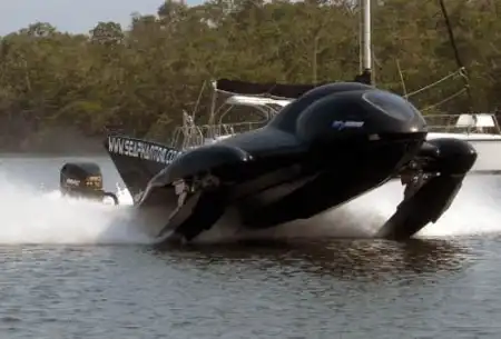 Разогнавшись до определенной скорости (около 50 км/ч), он выдвигает 1,8-метровые подводные крылья и начинает почти что лететь над водной поверхностью. В пространстве между днищем Sea Phantom и водой создается подъемная сила, снижающая его вес, так что на такой высокой скорости расход топлива, вопреки ожиданию, снижается: как подсчитали разработчики, «летя» над водой, катер затрачивает горючего в 5 раз меньше, чем обычные суда таких же размеров.