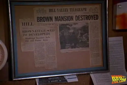 В 1985 году Док Браун живет в гараже своей виллы из 1955 года. Сам же дом сгорел! В начале фильма это можно прочесть на вырезках из газеты, висящих на стене. Кроме того, там же написано, что он продал свою землю девелоперам - поэтому в 1985 году рядом с домом Брауна стоит ресторан Burger King.