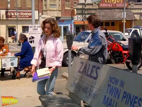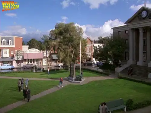 Все сцены 1985 года на площади перед зданием суда были отсняты к концу съемок. Сначала кулисы города были созданы в ярких тонах для 1955 года, а потом «состарены» и ободраны для 1985 года. Многие лавки, существовавшие в 1955 году, закрыты в 1985. На скамейке, на которой сидят Марти и Дженнифер, красуется логотип ювелирного магазина «Zales», который теперь находится в торговом центре «Две елки». В 1955 году этот магазин расположен еще на главной площади!
