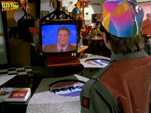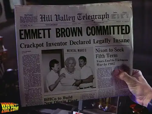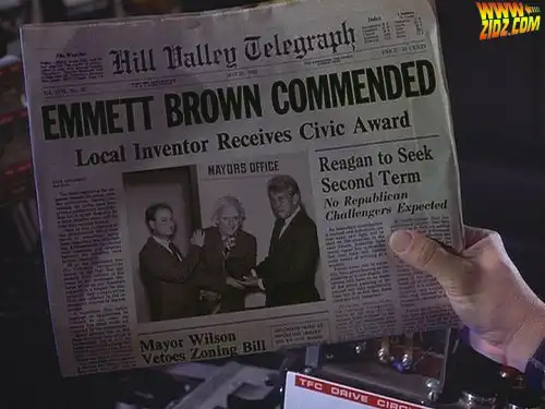 В газете, когда заголовок «Dr. Brown Committed» (Доктор Браун упрятан в психушку) превращается в «Dr. Brown Commended» (Доктор Браун награжден), изменяется еще один заголовок. «Nixon to Seek Fifth Term» (Никсон выставляет кандидатуру на пятый срок) изменяется на «Reagan to Seek Second Term» (Рейган выставляет кандидатуру на второй срок). Кроме того, в газете альтернативного времени война во Вьетнаме все еще не кончилась.