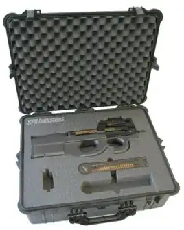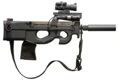 Р90 в варианте для спецназа. Оснащен оптическим прицелом, лазерным целеуказателем, фонарем, прибором бесшумно-беспламенной стрельбы и мешком для сбора стреляных гильз.