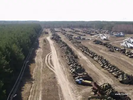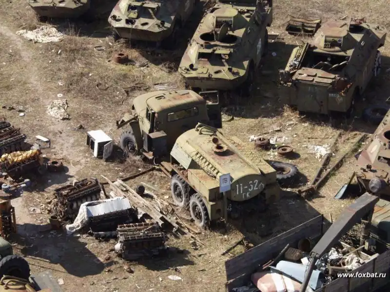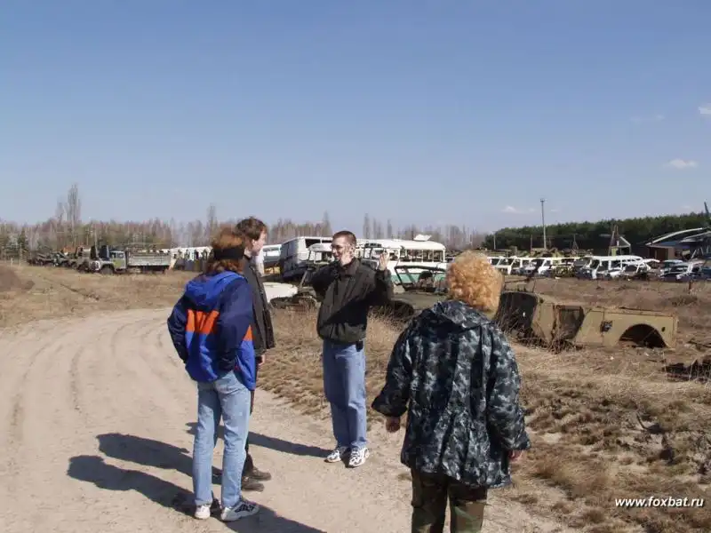 Мы проезжаем кладбище техники. Решено остановиться и сделать снимки. Мы залазим на нашу машину и фотографируем кладбище. Оно просто необъятных размеров. Рядами стоят "грязные" машины. Бронетранспортеры, грузовики, машины скорой помощи, пожарные машины, автобусы, экскаваторы, роботизированные бульдозеры и даже грузовые вертолеты (самые мощные в мире - подъем 50т). Я и Андрей лезем на двадцатиметровую вышку, чтобы сделать масштабные снимки кладбища, а тем временем наш проводник уговаривает охрану пустить нас на территорию кладбища при условии, что мы не сойдем с тропы и не будем касаться техники. С высоты вышки открывается огромная панорама кладбища. Дует ветер и вышка начинает ощутимо шататься. Мы спускаемся, Римма обо всем договорилась и мы входим на кладбище. Каждый из нас старается идти по центру дорожки, осторожно проверяя не появился ли металлический привкус во рту. Техника находится в очень запущенном состоянии, от некоторой остался только остов. Римма говорит, что очень "грязную" техника сразу хоронили на большой глубине. Мы идем вдоль рядов машин и представляем, как в ту ночь бригады спасателей, пожарников и солдат грузились на эту технику и ехали к горящему реактору. Мы останавливаемся у понравившейся техники и делаем снимки, очень ярко светит солнце, приходится при фотографировании закрывать руками объектив фотоаппарат, создавая тень. Римма рассказывает о роботах, о том как японские человекоподобные роботы падали на крыше или начинали жутко дергаться и валиться с крыши, как бы кончая жизнь самоубийством.