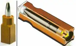 безгильзовые патроны - слева ранняя разработка, справа - окончательный вариант патрона DM11 (вид в разрезе)