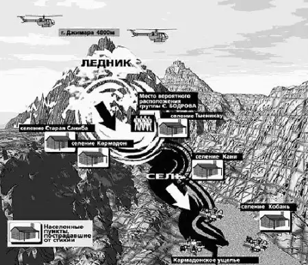Когда в семь утра они приехали в горы, картина была шокирующей. Ледник упал с высоты двух километров и за девять минут, срезая скалы, снес вмертвую восемнадцать с половиной километров. Высоко на скалах остались следы от птиц. Их припечатало к скалам, как слепки. Везде лежал черный лед, заваленный камнями. Масса торчала ершом, шевелилась, лопалась как живая. Никаких иллюзий не оставалось...