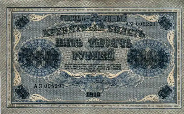 5000 рублей, 1918 год (выпускались до 1919), реальный размер 212*132 мм.