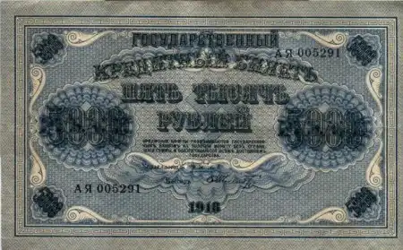 Итак, в 1918 году в руках советского правительства оказались клише целой серии государственных кредитных билетов от 1 до 10000 рублей, хотя и с гербом Временного правительства, но без монархических регалий, что позволяло срочно провести выпуск бумажных денег, пусть даже не удовлетворяющих требованиям новой идеологии. Однако развернувшаяся Гражданская война и связанные с ней чрезвычайно большие экономические трудности надолго задержали эмиссию денег. Они были изготовлены только в 1919 году, хотя на них был проставлен 1918 год выпуска. Государственные кредитные билеты достоинством в 5000 и 10000 рублей с изображением свастики появились в советском денежном обороте почти через три года после того, как этот символ был применен правительством князя Львова в 1917 году.