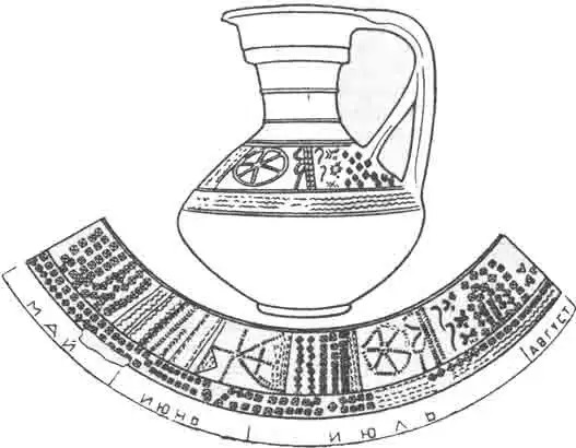 …Необходимость в календаре появляется у каждого народа в связи с возникновением земледелия, что, как известно, произошло в неолите. Таким образом, в течение нескольких тысячелетий до прихода на Русь юлианского славяне должны были пользоваться другим календарем, и они им действительно пользовались. Один вариант такого календаря, изображенный на поверхности глиняного сосуда, датируемого IV веком нашей эры, был обнаружен археологами в селе Ромашки Киевской области и в 1962 году расшифрован академиком Б. А. Рыбаковым. Система знаков его говорит о синкретизме славянских календарных представлений.