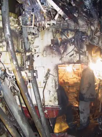Так, видимо, от холода, страха и по причине темноты, кто-то меняя регенеративный патрон, выронил его в воду, которая потихоньку прибывала через муфты гребных валов. Вода была смешана с маслом, поэтому упавший регенеративный патрон, мгновенно вызвал объемный пожар."