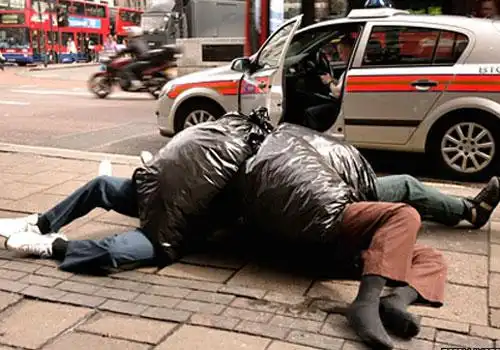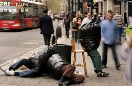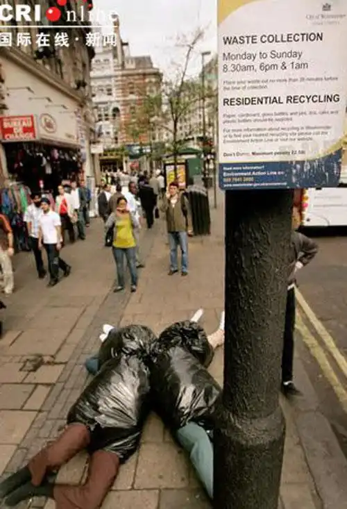 Нет-нет, это не чьи-то совсем неживые тела, обернутые в полиэтиленовую пленку, валяются возле урны для мусора... Не волнуйтесь и расслабьтесь, это скульптуры Марка Дженкинса...Художника, который создаёт проекты для улицы...