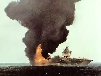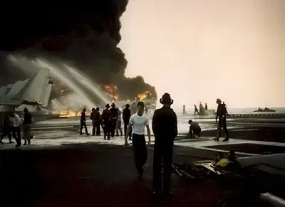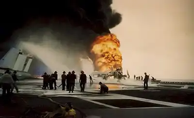 14 января 1969 года, в результате падения плохо закрепленной 500 кг. авиабомбы произошел взрыв на палубе. 23 погибших, 343 раненых, 15 самолетов уничтожено.