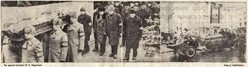 А вот уже хоронят самого Черненко,- все как полагается... "Под гробом" можно углядеть Михаила Сергеевича Горбачева...