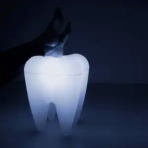 Еще один совершенно необычный предмет интерьера от известной в узких кругах тайской компании Propaganda — многофункциональная лампа "Зуб". Кроме своих прямых обязанностей по освещению прилегающей территории и оживления интерьера, эта лампа может послужить еще и табуретом. Проще говоря, если просто поставить Зуб дома — будет красиво, если поставить и вкрутить в него цветную лампу — можно задать цветовые акценты и оживить тем самым интерьер, а если вы замерзли, то с помощью него можно и согреться, расположив на нем ноги или себя самого (Зуб выдерживает до 80 кг веса).