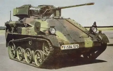 В ФРГ с середины 70-х годов для воздушно- десантных войск разрабатывается боевая гусеничная машина "Визель". Как сообщает западная печать, в текущем году должны начаться войсковые испытания четырех ее усовершенствованных опытных образцов. В отличие от образцов, созданных ранее, они имеют усиленнное вооружение и улучшенные ходовые качества. Максимальная скорость движения по шоссе достигает 85 км/ч. На двух машинах (имеющих первый вариант вооружения) установлена бронированная башня с 25-мм автоматической пушкой "Маузер" (вместо 20-мм пушки "Рейнметалл"), а на двух других - ПТРК "Toy", который может использоваться также и для стрельбы ПТУР "Тоу-2". Вместо бензинового двигателя применен более надежный и экономичный дизель с турбонаддувом мощностью 86 л.с.