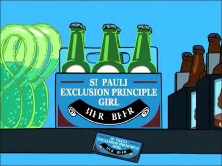 Там же появляются ещё две марки пива: Olde Fortran и St. Pauli's Exclusion Principle Girl. Название первой происходит от классического языка программирования Фортран, использовавшегося на заре программирования для написания программ математических расчетов (собственно, и его название состоит из фрагментов слов FORmula TRANslation).