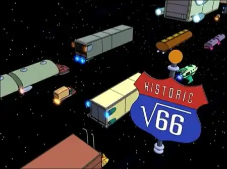 «Историческая трасса корень из 66» появляется в эпизоде 3ACV02 Parasites Lost. Что любопытно, в английском языке слова rout (трасса) и root (корень) произносятся практически одинаково.