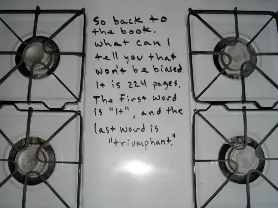"Итак, вернемся к книге. То, что я скажу, не будет необъективным. В книге 224 страницы. Первое слово - "It", а последнее - "triumphant""