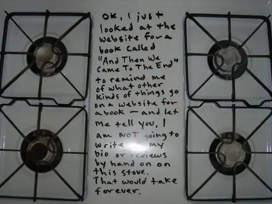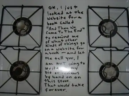 "ОК, я просто глянула на веб-сайт книги "And Then We Came To The End", чтобы вспомнить что должно быть на сайте книги - и позвольте мне вас заверить, я не собираюсь писать свою биографию или обзоры на этой плитке. Это займет вечность"