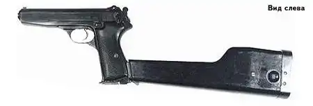 Питание патронами производится с двухрядного магазина с шахматным расположением патронов. Пистолет, по аналогии с известной системой , имеет жесткую деревянную кобуру. Кобура используется в качестве приклада для более жесткой фиксации при стрельбе, особенно в режиме автоматического огня.