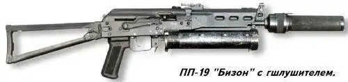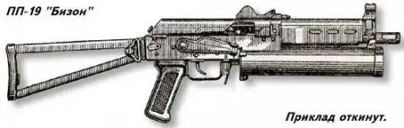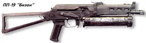 В 1993 году Калашников и Драгунов (младшие) изготовили первый вариант нового пистолета-пулемета под названием ПП-19 "Бизон". Он был разработан под "макаровский" патрон 9х18 (как стандартный, так и высокоимпульсный, модернизированный). Его отличительной чертой является наличие шнекового (от нем. "шнек" - "улитка") подствольного магазина емкостью 64 патрона. В процессе дальнейшей доработки конструкции, основывающейся на унификации с автоматом Калашникова (60% деталей "Бизона" заимствованы у АК), появились две модификации - "Бизон-2" и "Бизон-2Б".