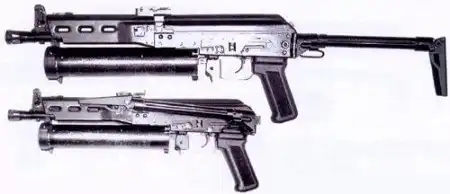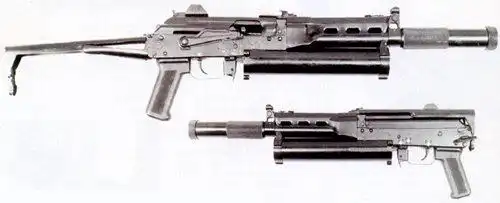 Что касается модификации (индекс означает ), то его отличает оригинальное решение конструкции приклада. Жесткий металлический приклад складывается и фиксируется в верхнем положении над крышкой ствольной коробки. Несомненно, это более эргономичное решение, при этом прочностные характеристики ничуть не уступают автоматному варианту, и боец при необходимости может использовать приклад в рукопашной схватке. Заднее прицельное устройство также претерпело существенные изменения. Вместо открытого прицела появился диоптр. предназначен для работы только с глушителем.