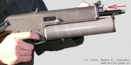 Взведение затвора у ПП-90М1 осуществляется при нажатии на "кнопку" над дульной частью ствола.