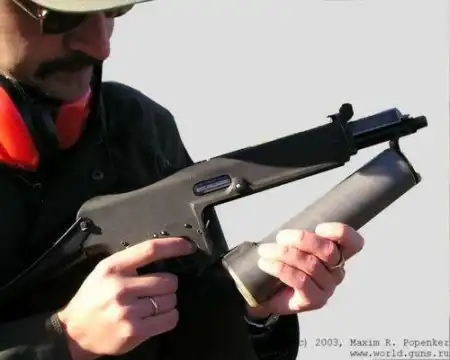 пистолет-пулемет ПП-90М1 с цевьем - адаптером для коробчатых магазинов (внизу) с винтовым ("шнековым") магазином повышенной емкости (вверху)