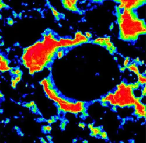 На этом изображении, полученном с помощью электронного микроскопа, видно как аморфный кремний, выделенный красным, цементирует "чёрный" известняк...