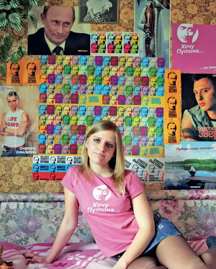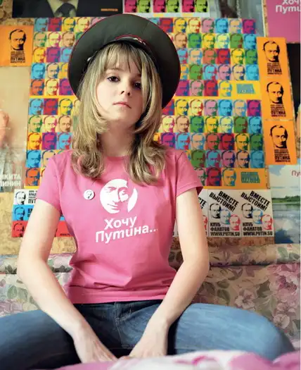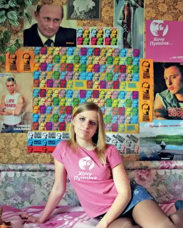 Таня Архипова, студентка Московского областного медицинского колледжа, 18 лет: «У меня есть две футболки — одна была сделана для акции у посольства Грузии, на ней изображены Буш и Саакашвили и надпись «Все они марионетки в ловких и натруженных руках», значок, флаг, обои на рабочем столе, много разных открыток с его изображением. На Путина я обратила внимание в 1999 году. Хоть мне и было тогда 11 лет, я четко понимала, что президент у нас не тот. И когда пришел новый человек, я стала интересоваться его личностью, его политикой и программами. Мне нравится, как Путин относится к детям, к своей жене, я думаю, он прекрасный муж. У меня есть несколько книг о нем. Самые любимые — Андрея Колесникова: «Меня Путин видел!» и «От первого лица. Разговоры с Владимиром Путиным».