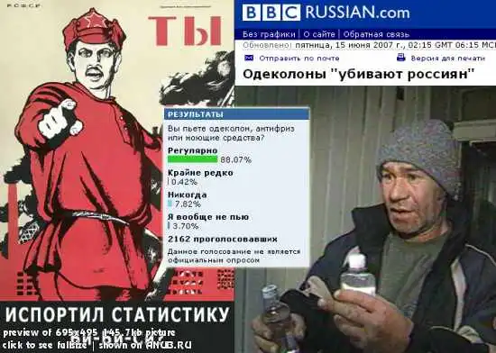 Сайт BBCRussian.Com устроил опрос "Вы пьете одеколон, антифриз или моющие средства?". Россияне, не обделённые чувством юмора, стали отвечать на вариант "Регулярно", затем посылать ссылку на страницу своим друзьям сперва на форумах, а затем через ICQ и другие инстант мессенджеры. В результате голосование превратилось в масштабный флэш-моб.