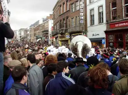Второй день - народное гулянье - на него мы не поехали. А вот на третий день (Mardi Gras) полноправными хозяевами являются Жилли. Жиль это местный символ карнавалов (особенно провинции Энно). Сотни жиллей заполняют улочки города (и пивные) Под звон трубы и барабанный бой они притоптывают в своих деревянных башмаках в такт и позванивают колокольчиками. Собравшись на центральной площади, водят хороводы, они танцуют прощальный танец и внезапно рассеявшись растворяются вновь, чтобы через некоторое время вновь собраться в шествие… Мы попали как раз между апельсиновыми боями, что помогло спасти фотоаппаратуру от точного попадания апельсина, которые тучами летают по улицам и затем те которые разбились, как после града грудами оранжевых шаров валяются на улице, а те, что были ловко пойманы туристами на месте сьедаются.