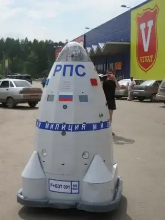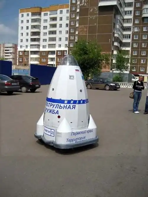 Робот-полицейский яйцевидной формы, высотой около двух метров, передвигается на четырех колесах со скоростью 5 км/ч.