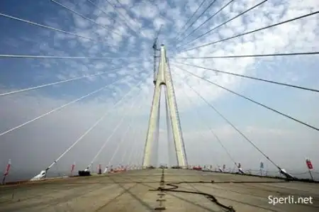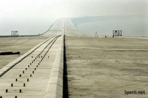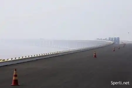 По мосту предусмотрено движение транспорта по шести полосам. Максимальная скорость движения автомобилей над морем составит 100 километров в час… Конструкция из бетона и стали устойчива к тайфунам.