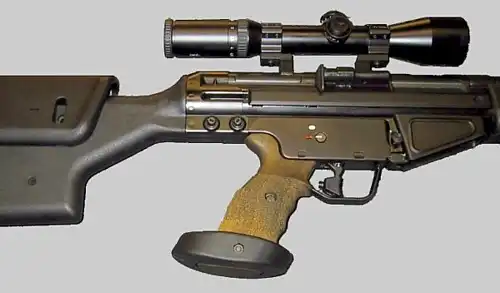 В середине 80х годов фирма Heckler und Koch, в сотрудничестве с различными противотеррористическими организациями, включая немецкую GSG9 и британскую SAS, создала дальнобойную самозарядную снайперскую винтовку PSG-1. Винтовка создана на базе штатной автоматической винтовки Бундесвера HK G3, и использует тот же принцип - полусвободный затвор с замедлением при помощи роликов. От G3 отличается невозможностью ведения огня очередями, специальным тяжелым стволом длиной 650 мм с полигональными нарезами, измененным регулируемым прикладом с упором для щеки, регулируемым спусковым крючком, измененной рукояткой управления огнем в спортивном стиле и специальными направляющими на ствольной коробке для крепления оптических прицелов. Кроме этого, PSG-1 имеет устройство "для бесшумного закрытия затвора" в виде кнопки позади окна для выброса гильз. Это устройство функционально аналогично досылателю затвора на американской винтовке М16А1. Стандартно PSG-1 поставляется с прицелом Hendsoldt 6X фиксированной кратности с подсветкой прицельной сетки. Открытых прицельных приспособлений PSG-1 не имеет. Вместо обычной для винтовок такого класса складной сошки PSG-1 как правило комплектуется отдельным упором под цевье, установленным на небольшой складной треноге.