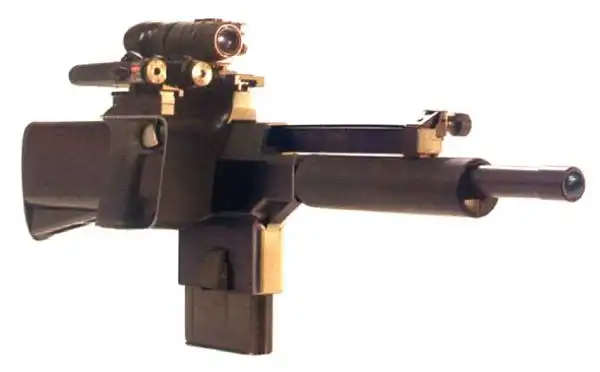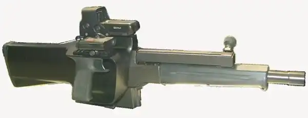 ручной самозарядный гранатомет DENEL PAW-20 "Neopup", оснащенный коллиматорным прицелом и лазерным целеуказателем