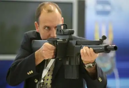 представитель корпорации DENEL демонстрирует "штурмовое оружие" PAW-20