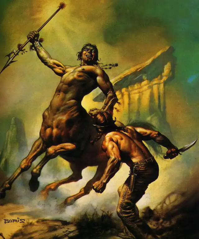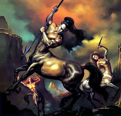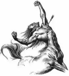 Кентавры - полулюди полулошади в греческой мифологии. Вместе с сатирами составляли свиту Диониса(греч.) отличаются буйным нравом и невоздержанностью, но некоторые кентавры, например Хирон, воплощают мудрость и благожелательность, воспитывают героев греческих мифов.