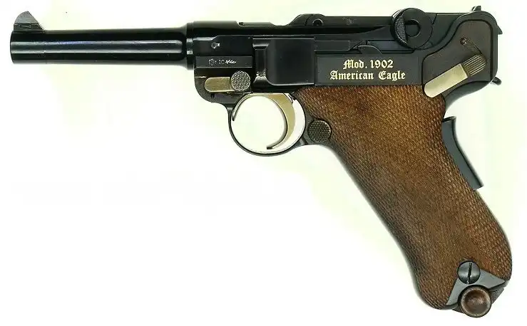 В 1900 году пистолеты Люгера были отправлены на испытания в США. Они проявили себя достаточно хорошо и тогда американцы дали заказ еще на 1000 пистолетов для продолжения испытаний, шедших вплоть до 1908 года. Большое недовольство американцев вызывал слишком маленький, на их взгляд, калибр данного оружия. Примерно в это же время небольшое количество Люгеров было продано на гражданском рынке США. В результате призывов по увеличению калибра компанией DWM в 1902 году был разработан новый патрон калибра 9 мм, впоследствии ставший известным как 9×19 мм Парабеллум. Название «Parabellum» происходит от латинской пословицы «Si vis pacem, para bellum», означавшей «Хочешь мира — готовься к войне» и служившей девизом компании DWM. В последствии патрон 9 мм «Люгер» стал самым массовым боеприпасом для пистолетов и пистолетов-пулеметов в мире.