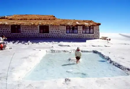 Благодаря туристам здесь стали появляться отели из соли, точнее, из соляных блоков. В них крыша, стены, столы и стулья, стойка в баре, кровати и, конечно же, пол сложены из блоков соли, добываемой неподалеку. А на стенах висят бумажки с вежливой просьбой: "Пожалуйста, не облизывайте!"