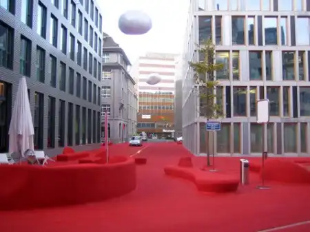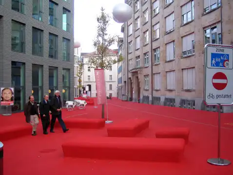 Ну и, само собой, впечатление от "stadtlounge" было бы совсем другим, если б не вездесущее красное покрытие. "Ковёр" выглядит равномерно и однородно, хотя сделан из разных материалов: на пешеходных дорожках это полиуретан с резиновой крошкой, как на стадионах, в других местах слой крашеной смолы.