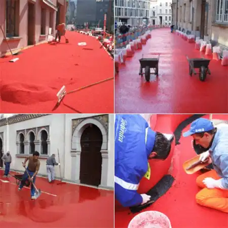Так или иначе, покрытие не боится ни снега, ни мороза, ни жары, ни соли — проверено строгими испытаниями. Оно водопроницаемое и совсем не скользкое, причём на некоторых участках "ковёр" толстый, многослойный, на других — нет. В общем, даже при серьёзных нагрузках это красное "одеяло" должно прослужить лет двадцать.