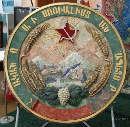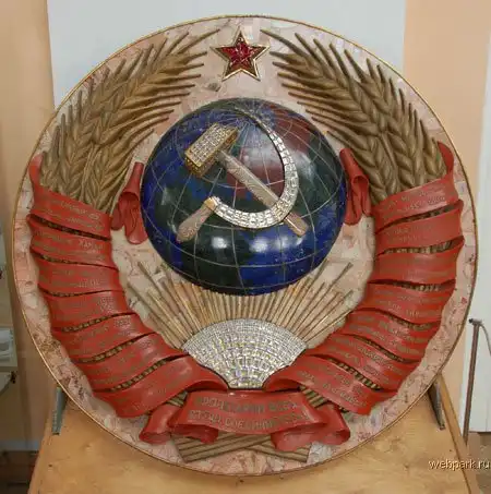 "Герб СССР и 11 гербов Союзных республик (Россия, Белоруссия, Украина, Грузия, Азербайджан, Армения, Таджикистан, Узбекистан, Киргизия, Туркменистан, Казахстан).