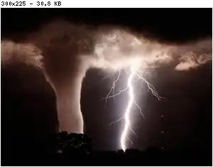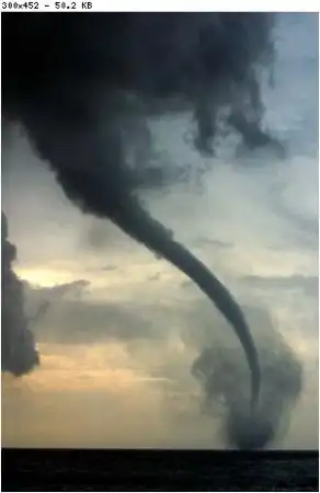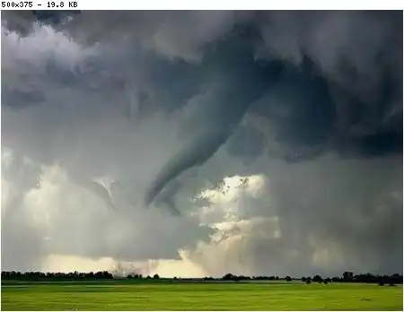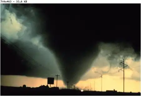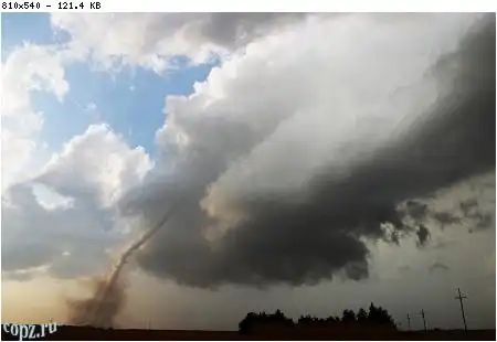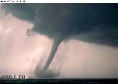 Итак, пока что известно, что в центре торнадо находится область пониженного давления. В самых мощных торнадо перепад давления снаружи и внутри может превышать одну десятую атмосферы. Собственно, сам торнадо представляет собой наружний воздух, который под действием этого перепада давления пытается заполнить внутренность торнадо, но из-за закона сохранения момента импульса так сильно закручивается вокруг оси, что центробежная сила не подпускает его к центру.