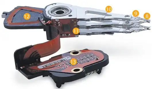 Все начинается с подачи питания (1) на шпиндельный двигатель с помощью специальных контактов (5). Микропроцессор контроллера (3) посылает команды драйверу актуатора (6). Магнитные головки (8) считывают информацию с пластины, вращающейся с большой скоростью (они «парят» над ней за счет возникающей воздушной подушки). Точное позиционирование головок над поверхностью дисков обеспечивают подвеска (9) и штанги (10), а передвижение осуществляется с помощью магнитной катушки актуатора (12). Полученные данные проходят через усилитель (11) и по шлейфу (13) поступают на плату контроллера к контактам (7). После чего обрабатываются в микропроцессоре (3), а в качестве буферной памяти выступает кэш (2). Интерфейсный разъем SATA (4) служит для получения запросов от SATA-контроллера материнской платы и передачи данных.
