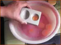 5. Подкрашенный “белок” помещается в специальную формочку, из которой выливается в раствор хлорида кальция, который стабилизирует форму получившегося “желтка”.