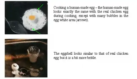 Подделки очень похожи на настоящие, имеют скорлупу, желток и белок. Но при их готовке можно почувствовать запах химикатов, а их скорлупа более хрупка, чем у реальных куриных яиц. А изготавливаются фальшивки следующим образом: